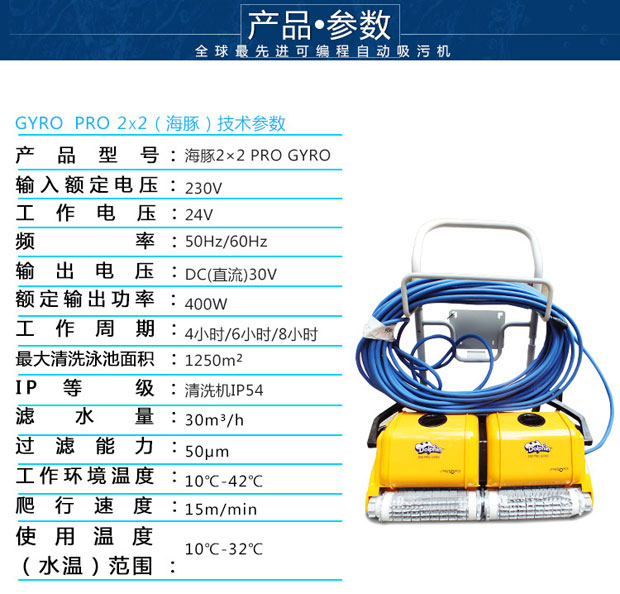 海豚2x2游泳池吸污機是以色列軍工轉(zhuǎn)民用產(chǎn)品代表,配電線防纏繞設(shè)備,配陀螺儀,標(biāo)準(zhǔn)直線行走,可爬墻清洗池壁及水線,近幾屆奧運會指定使用產(chǎn)品,全球市場份額40%。